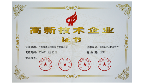 近日,公布了《2016年國家高新技術(shù)企業(yè)復(fù)審結(jié)果》,廣東普賽達(dá)密封粘膠有限公司榜上有名,標(biāo)志著公司順利通過高新復(fù)審,再次被認(rèn)定為高新技術(shù)企業(yè),現(xiàn)已頒發(fā)證書。(證書編號:GR201644000573)
