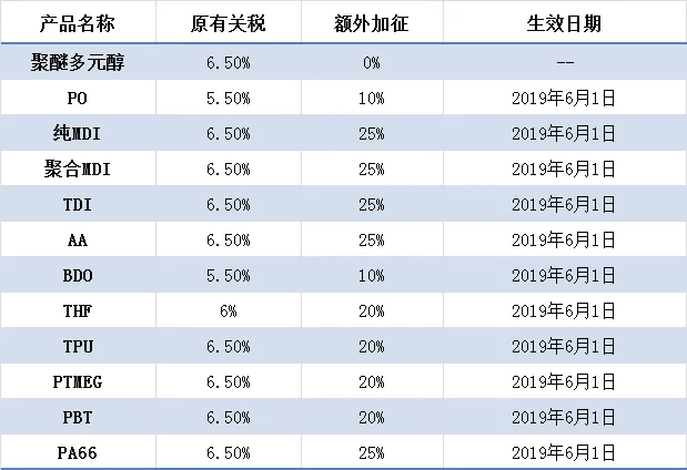 表一:美國對(duì)自中國進(jìn)口PU原材料額外加征關(guān)稅的情況