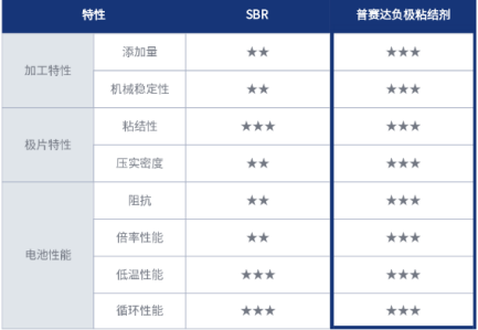 針對(duì)負(fù)極材料的特性,惠州普賽達(dá)研發(fā)的負(fù)極粘結(jié)劑是丙烯酸酯共聚物乳液,有著40%固含和適當(dāng)?shù)漠a(chǎn)品粘度,其優(yōu)異的粘結(jié)性能使其添加量?jī)?yōu)于日本最高技術(shù)水平的SBR產(chǎn)品;具有優(yōu)異的加工性能,穩(wěn)定性好,且高速攪拌不易破乳;惠州普賽達(dá)負(fù)極粘結(jié)劑可針對(duì)客戶應(yīng)用場(chǎng)景,在合成共聚物中引入功能團(tuán),調(diào)整粘結(jié)劑Tg,改善低溫性能