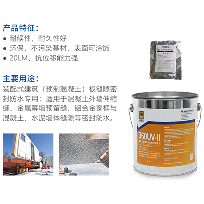 360UV-II 裝配式改性硅烷密封膠是雙組分改性硅烷膠,具有良好的柔韌性,與水泥、石材等多種基材粘接性較好,固化不產(chǎn)生氣泡。